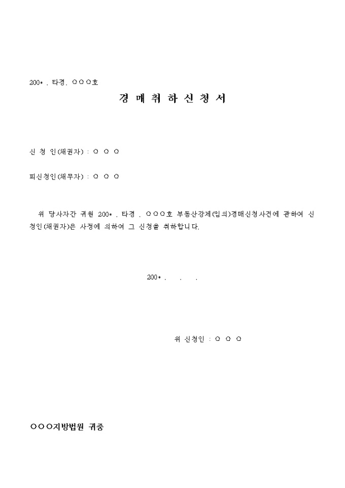 위 당사자간 귀원 200* . 타경 . ○○○호 부동산강제(임의)경매신청사건에 관하여 신청인(채권자)은 사정에 의하여 그 신청을 취하합니다.