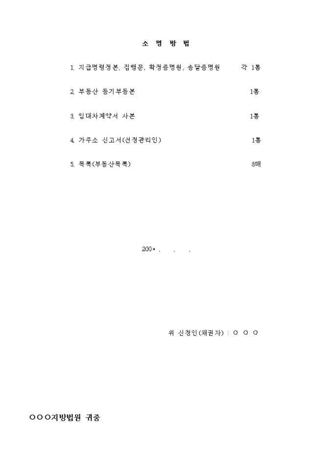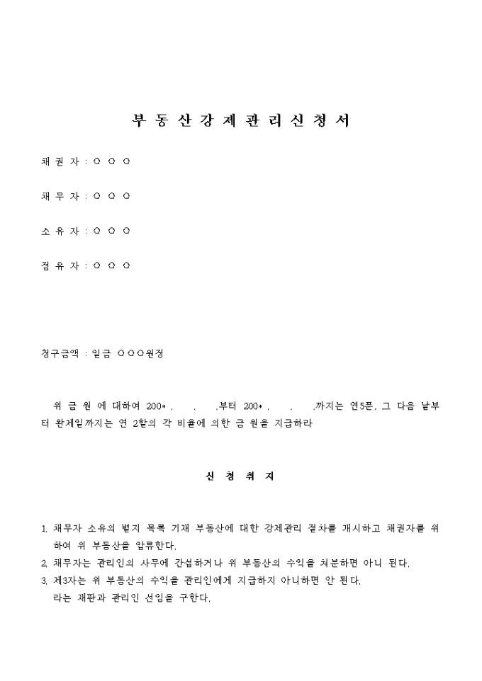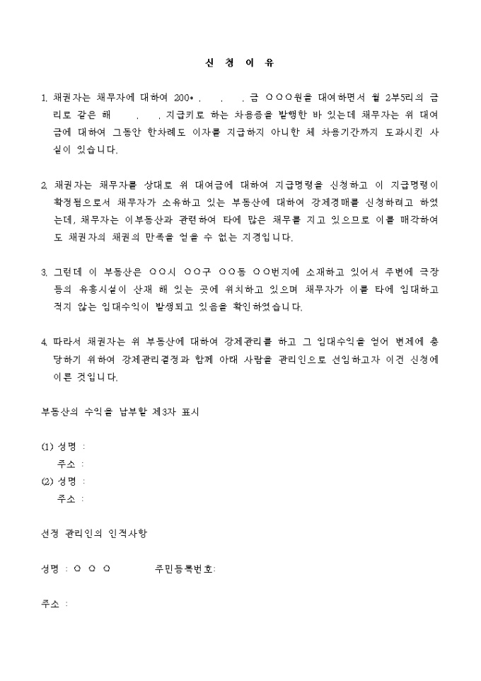 9,000원/월채무자 소유의 별지 목록 기재 부동산에 대한 강제관리 절차를 개시하고 채권자를 위하여 위 부동산을 압류한다. 채무자는 관리인의 사무에 간섭하거나 위 부동산의 수익을 처분하면 아니 된다. 제3자는 위 부동산의 수익을 관리인에게 지급하지 아니하면 안 된다. 라는 재판과 관리인 선임을 구한다.