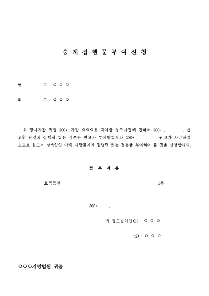 위 당사자간 귀원 200*. 가합 ○○○호 대여금 청구사건에 관하여 200* . . . 선고한 판결의 집행력 있는 정본은 원고가 부여받았으나 200* . . . 원고가 사망하였으므로 원고의 상속인인 아래 사람들에게 집행력 있는 정본을 부여하여 줄 것을 신청합니다.