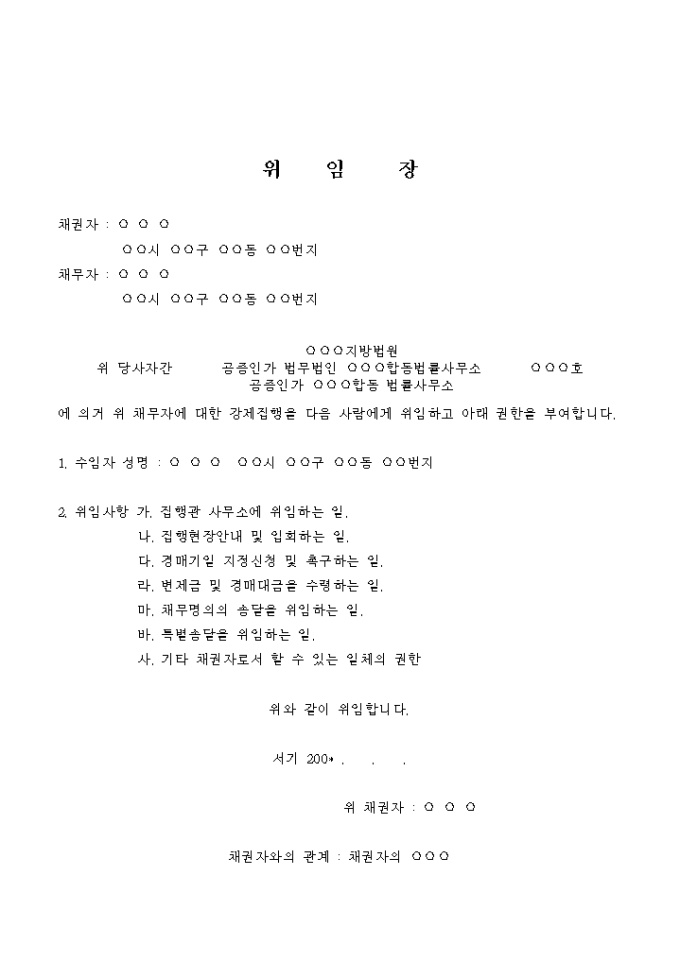 9,000원/월위 당사자간 공증인가 법무법인 ○○○합동법률사무소에 의거 위 채무자에 대한 강제집행을 다음 사람에게 위임하고 아래 권한을 부여합니다.