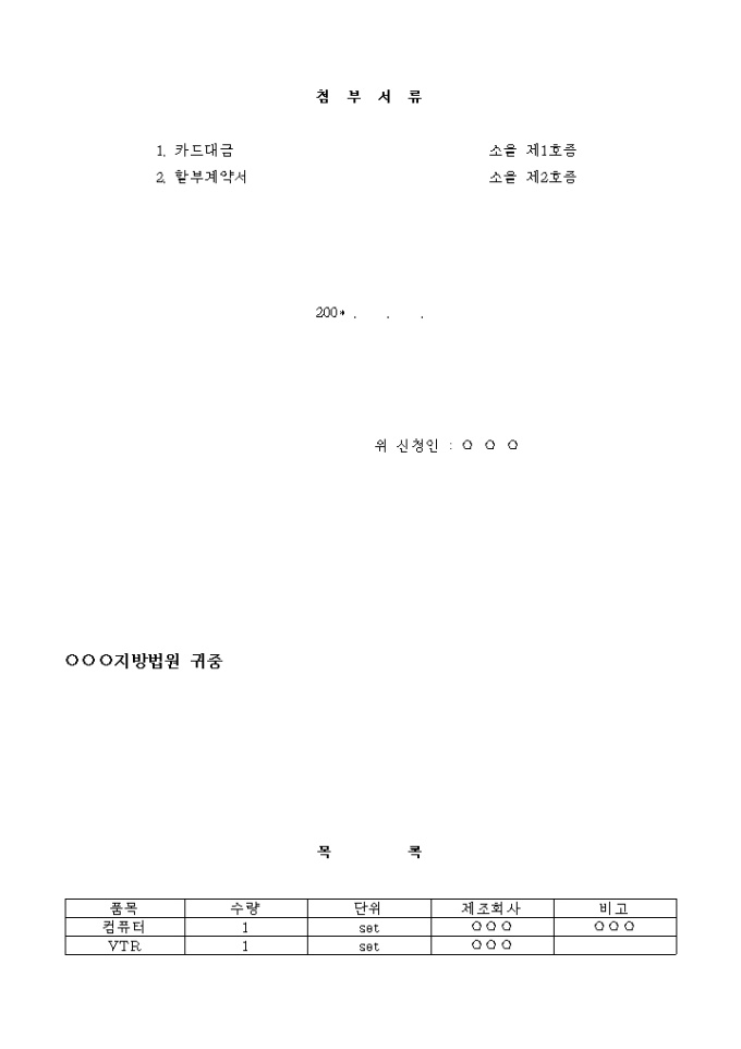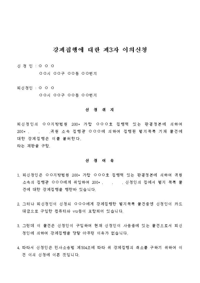9,000원/월피신청인의 ○○지방법원 200* 가합 ○○○호 집행력 있는 판결정본에 의하여 200* . . .귀원 소속 집행관 ○○○에 의하여 집행된 별지목록 기재 물건에 대한 강제집행은 이를 불허한다.