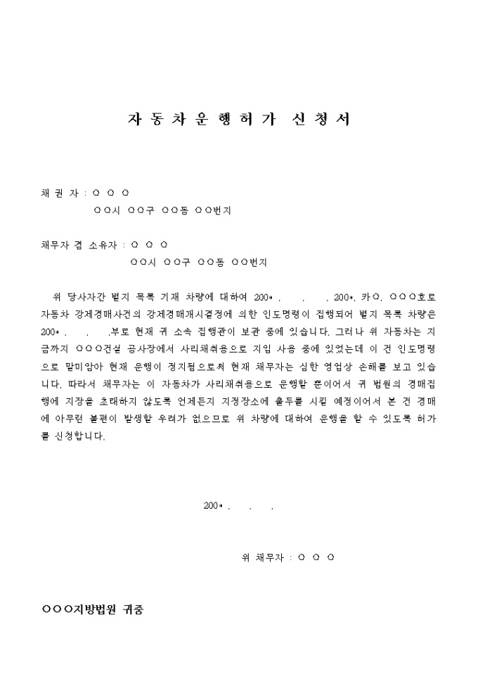 9,000원/월위 자동차는 지금까지 ○○○건설 공사장에서 사리채취용으로 지입 사용 중에 있었는데 이 건 인도명령으로 말미암아 현재 운행이 정지됨으로써 현재 채무자는 심한 영업상 손해를 보고 있습니다. 따라서 채무자는 이 자동차가 사리채취용으로 운행할 뿐이어서 귀 법원의 경매집행에 지장을 초래하지 않도록 언제든지 지정장소에 출두를 시킬 예정이어서 본 건 경매에 아무런 불편이 발생할 우려가 없으므로 위 차량에 대하여 운행을 할 수 있도록 허가를 신청합니다.