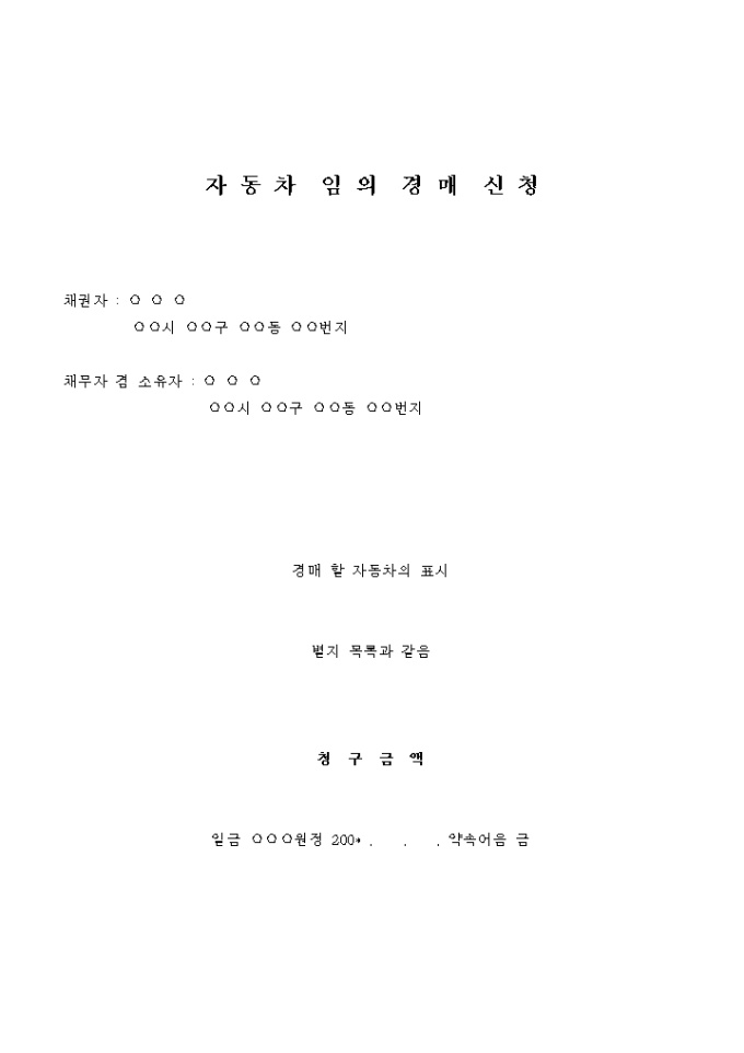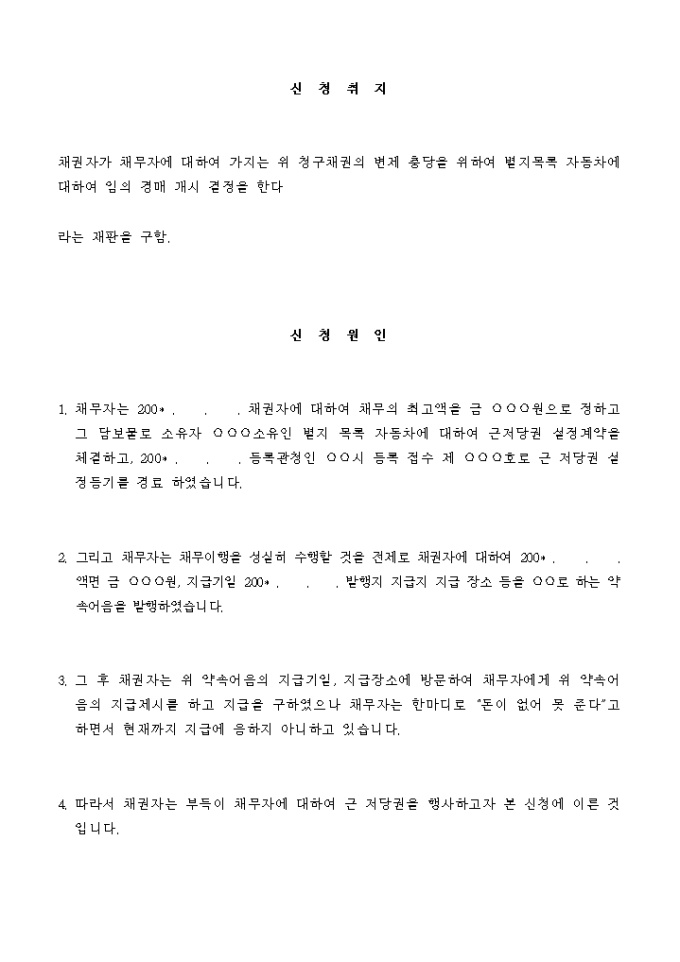 9,000원/월채권자가 채무자에 대하여 가지는 위 청구채권의 변제 충당을 위하여 별지목록 자동차에 대하여 임의 경매 개시 결정을 한다