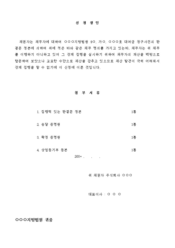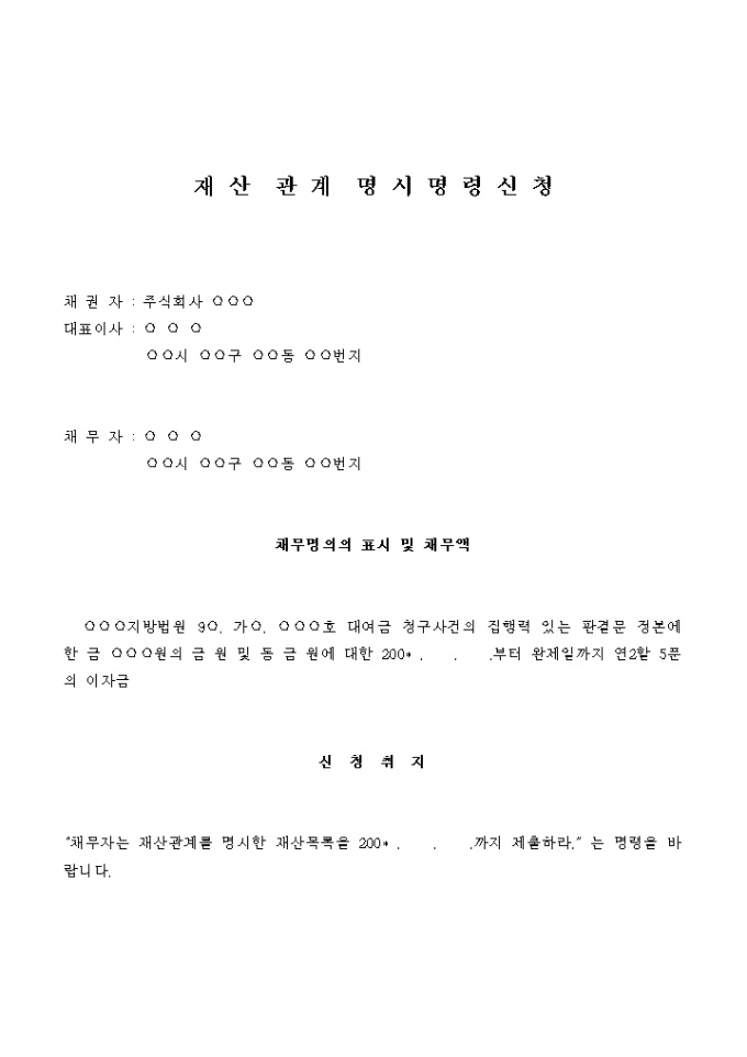 9,000원/월○○○지방법원 9○. 가○. ○○○호 대여금 청구사건의 집행력 있는 판결문 정본에 한 금 ○○○원의 금 원 및 동 금 원에 대한 200* . . .부터 완제일까지 연2할 5푼의 이자금을 지급할 것을 명한다.