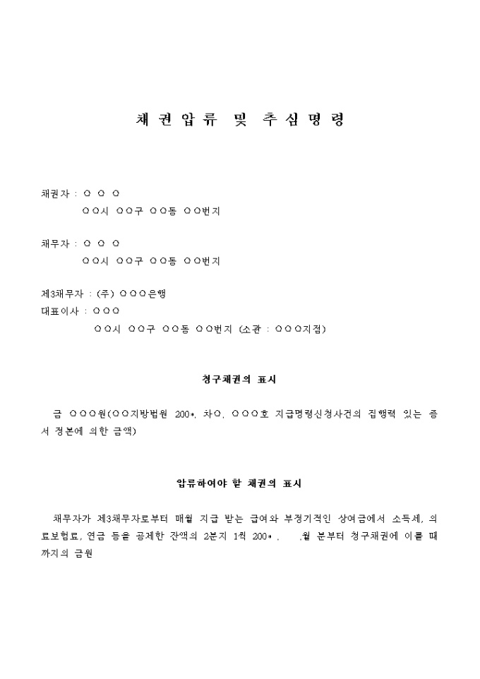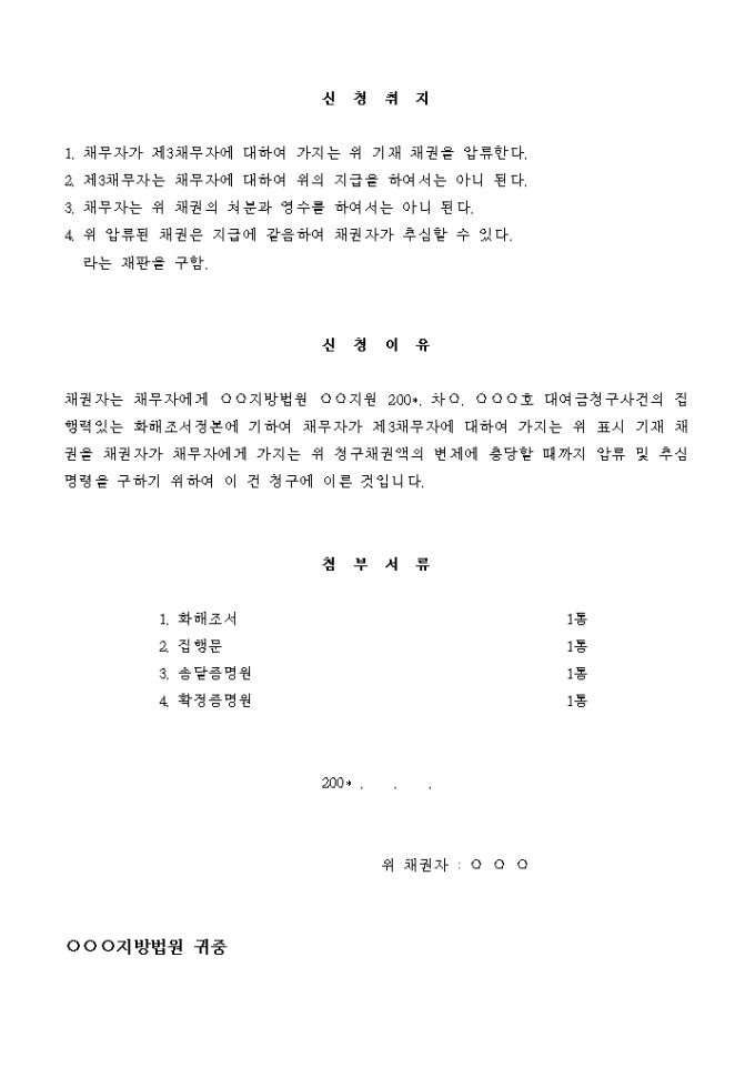 채권자는 채무자에게 ○○지방법원 ○○지원 200*. 차○. ○○○호 대여금청구사건의 집행력있는 화해조서정본에 기하여 채무자가 제3채무자에 대하여 가지는 위 표시 기재 채권을 채권자가 채무자에게 가지는 위 청구채권액의 변제에 충당할 때까지 압류 및 추심명령을 구하기 위하여 이 건 청구에 이른 것입니다.