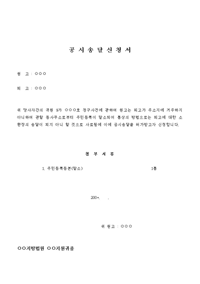 위 당사자간의 귀원 9가 ○○○호 청구사건에 관하여 원고는 피고가 주소지에 거주하지 아니하여 관할 동사무소로부터 주민등록이 말소되어 통상의 방법으로는 피고에 대한 소환장의 송달이 되지 아니 할 것으로 사료됨에 이에 공시송달을 허가받고자 신청합니다.