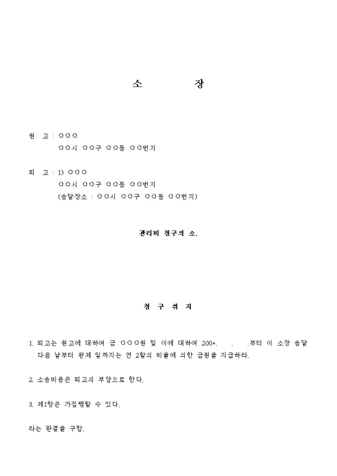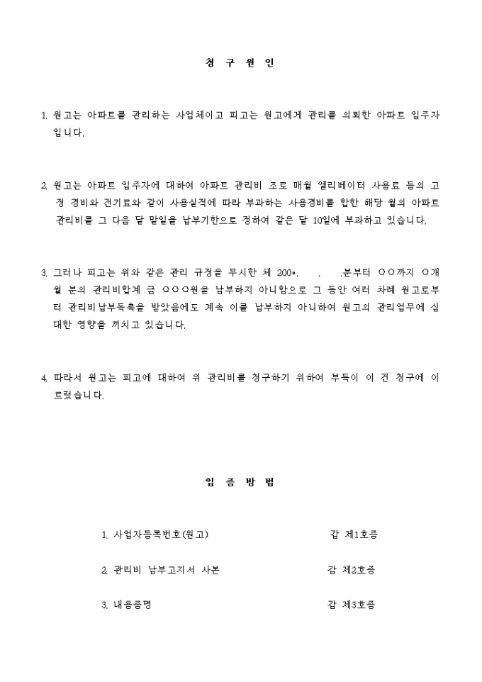 9,000원/월피고는 위와 같은 관리 규정을 무시한 체 200*. . .분부터 ○○까지 ○개월 분의 관리비합계 금 ○○○원을 납부하지 아니함으로 그 동안 여러 차례 원고로부터 관리비납부독촉을 받았음에도 계속 이를 납부하지 아니하여 원고의 관리업무에 심대한 영향을 끼치고 있습니다.