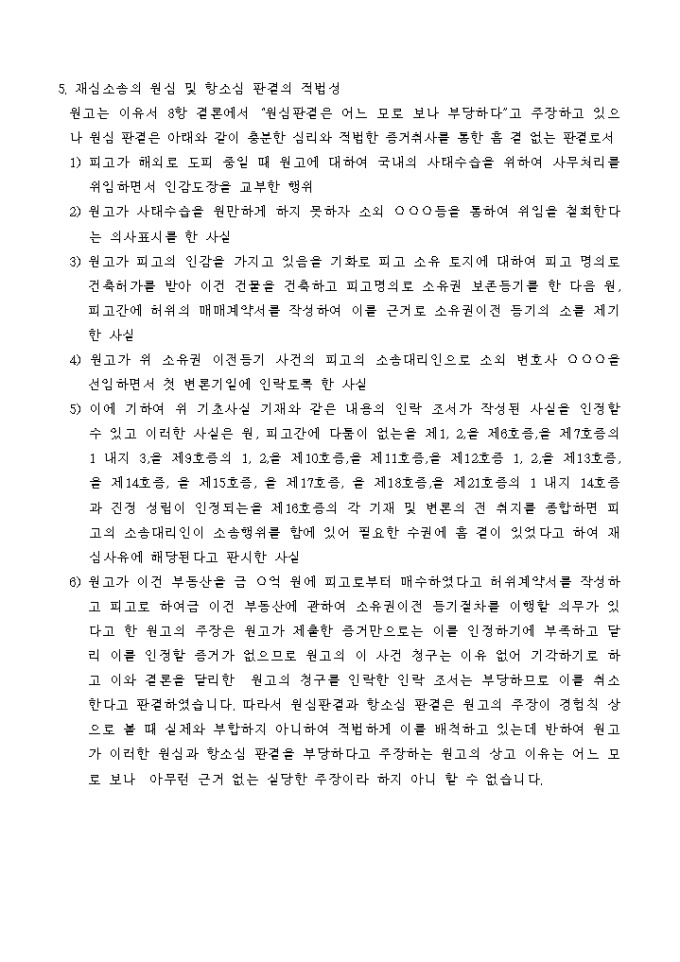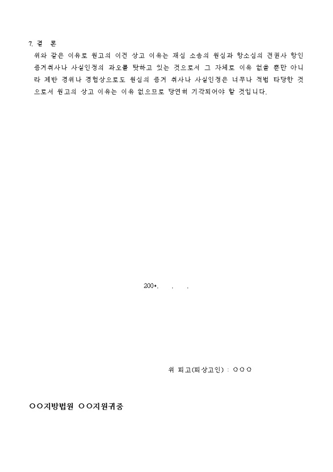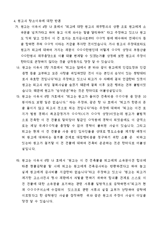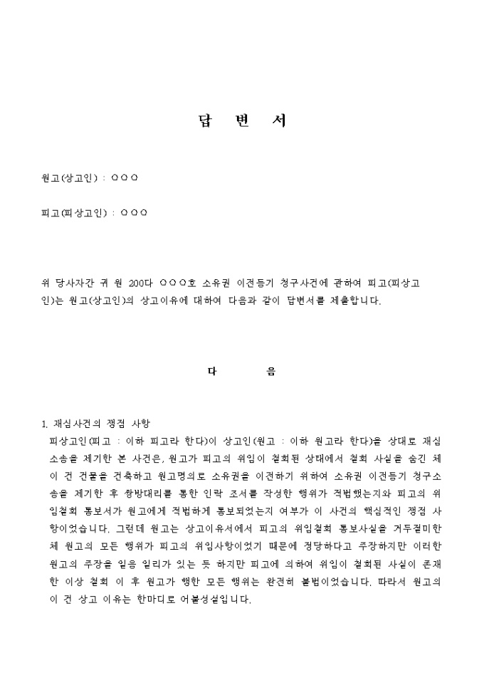 9,000원/월위 당사자간 귀 원 200다 ○○○호 소유권 이전등기 청구사건에 관하여 피고(피상고 인)는 원고(상고인)의 상고이유에 대하여 다음과 같이 답변서를 제출합니다.