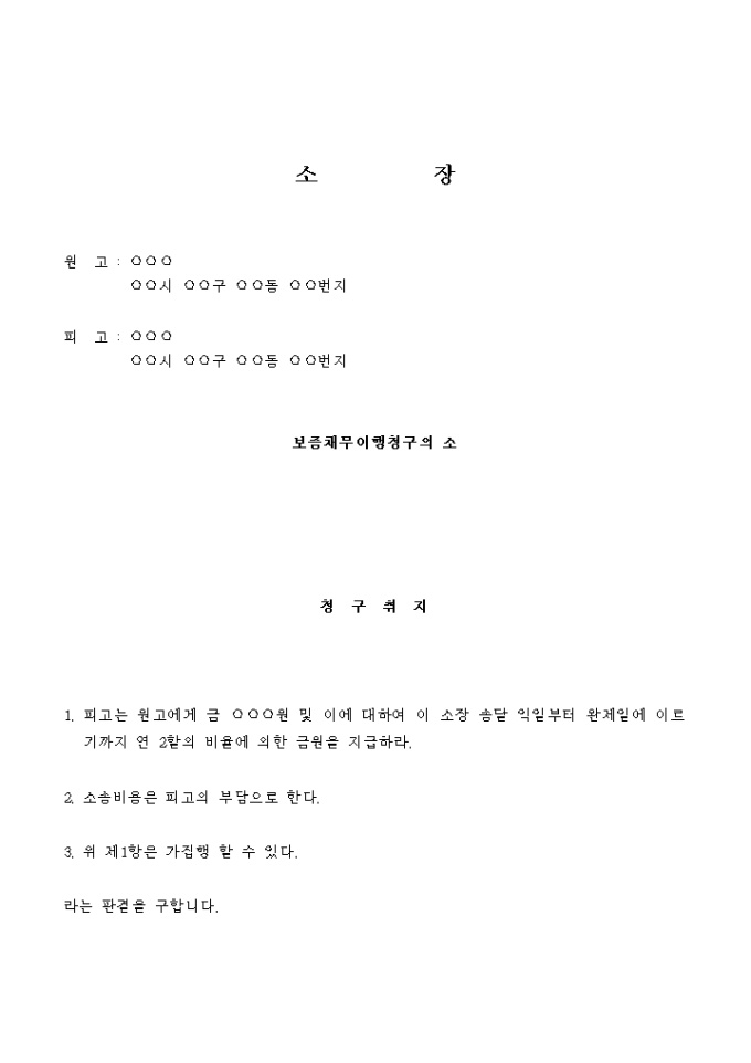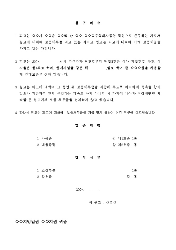 9,000원/월피고는 ○○시 ○○읍 ○○리 산 ○○ ○○○주식회사공장 직원으로 근무하는 자로서 원고에 대하여 보증채무를 지고 있는 자이고 원고는 피고에 대하여 아래 보증채권을 가지고 있는 자입니다.