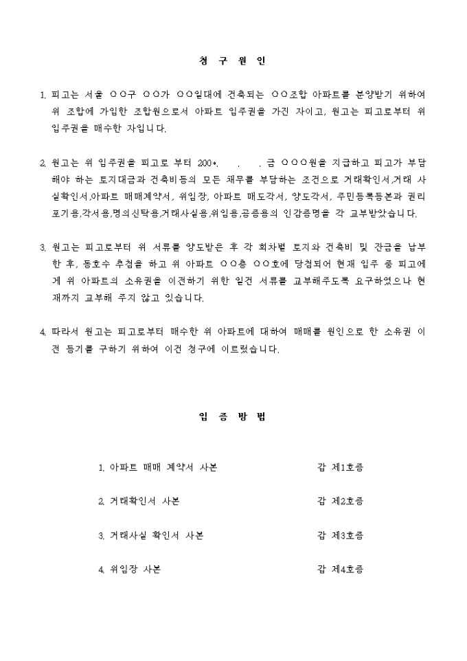 피고는 서울 ○○구 ○○가 ○○일대에 건축되는 ○○조합 아파트를 분양받기 위하여 위 조합에 가입한 조합원으로서 아파트 입주권을 가진 자이고, 원고는 피고로부터 위 입주권을 매수한 자입니다.