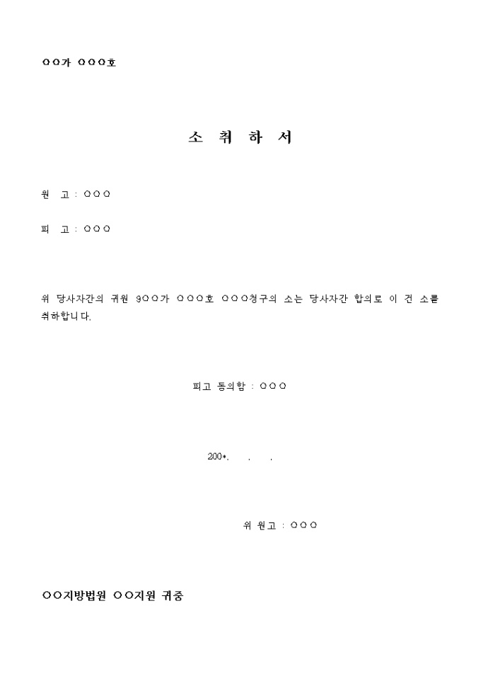 위 당사자간의 귀원 ○○ 가 ○○○호 200*. . .청구의 소는 당사자간 합의로 이 건 소를 취하합니다