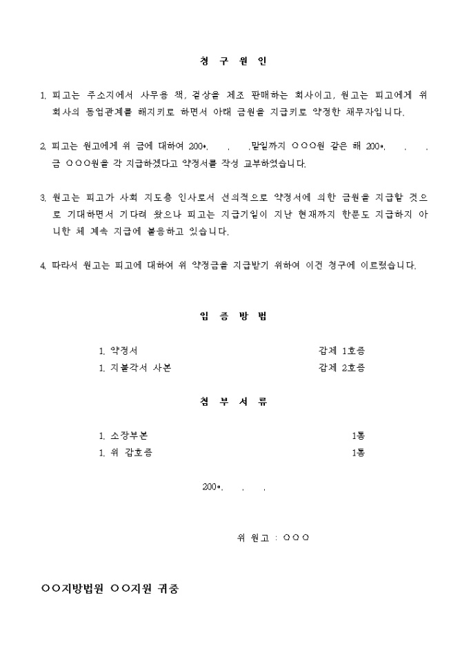 피고는 주소지에서 사무용 책, 걸상을 제조 판매하는 회사이고, 원고는 피고에게 위 회사의 동업관계를 해지키로 하면서 아래 금원을 지급키로 약정한 채무자입니다.