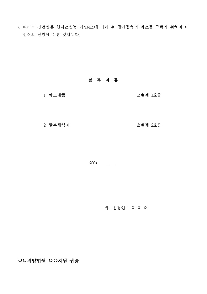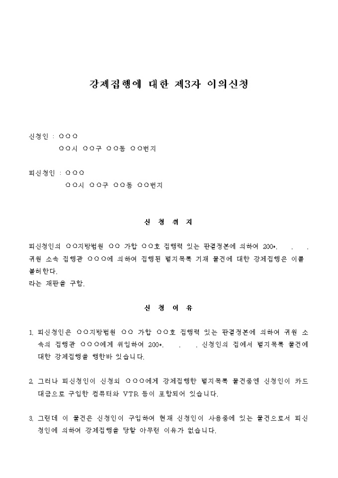 9,000원/월피신청인의 ○○지방법원 ○○ 가합 ○○호 집행력 있는 판결정본에 의하여 200*. . .귀원 소속 집행관 ○○○에 의하여 집행된 별지목록 기재 물건에 대한 강제집행은 이를 불허한다.