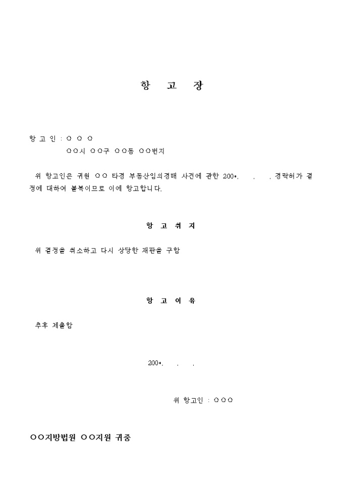 위 항고인은 귀원 ○○ 타경 부동산임의경매 사건에 관한 200*. . . 경락허가 결정에 대하여 불복이므로 이에 항고합니다.