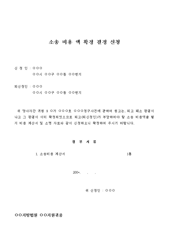 위 당사자간 귀원 9 ○가 ○○○호 ○○○청구사건에 관하여 원고는, 피고 패소 판결이 나고 그 판결이 이미 확정되었으므로 피고(피신청인)가 부담하여야 할 소송 비용액을 별지 비용 계산서 및 소명 자료와 같이 신청하오니 확정하여 주시기 바랍니다.