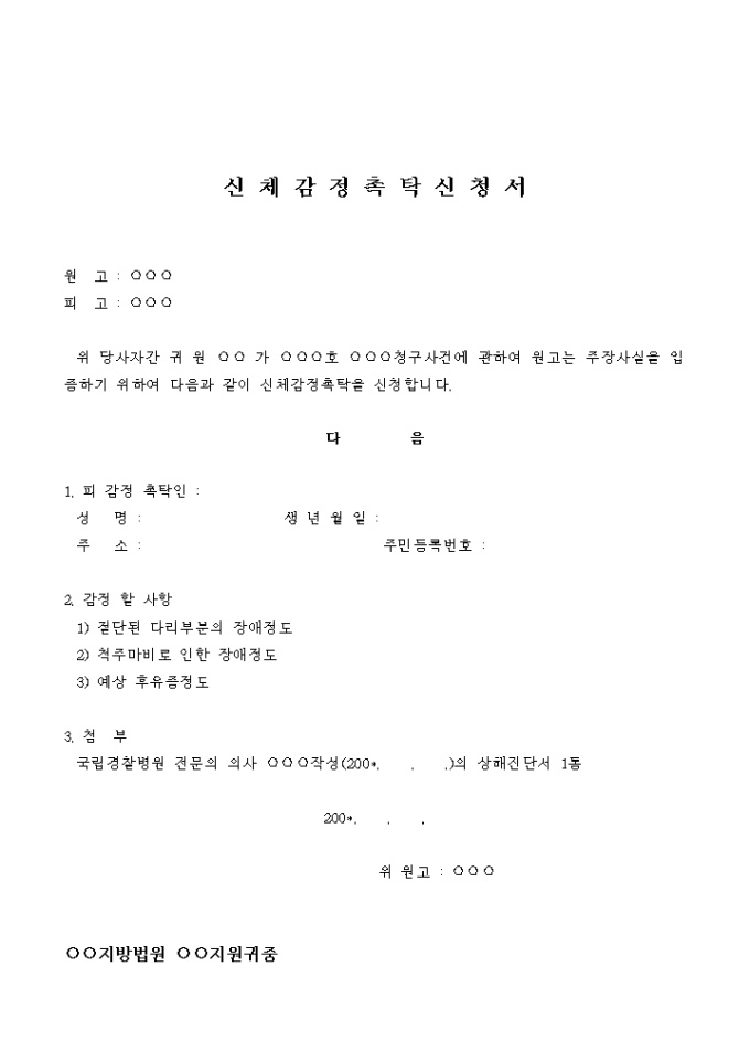 9,000원/월위 당사자간 귀 원 ○○ 가 ○○○호 ○○○청구사건에 관하여 원고는 주장사실을 입증하기 위하여 다음과 같이 신체감정촉탁을 신청합니다.