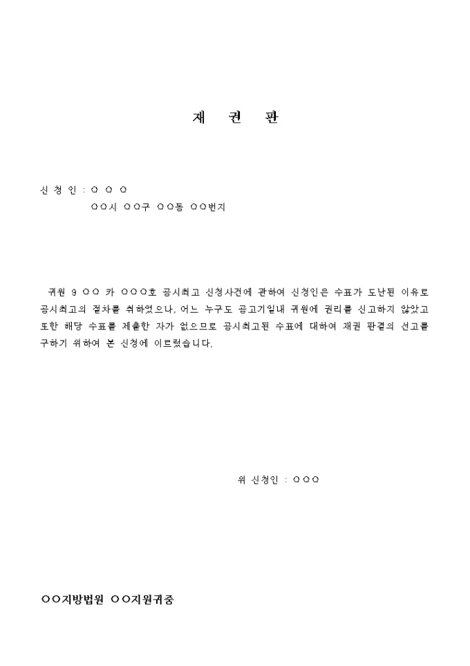 9,000원/월귀원 9 ○○ 카 ○○○호 공시최고 신청사건에 관하여 신청인은 수표가 도난된 이유로 공시최고의 절차를 취하였으나, 어느 누구도 공고기일내 귀원에 권리를 신고하지 않았고