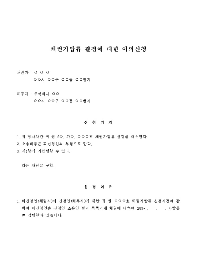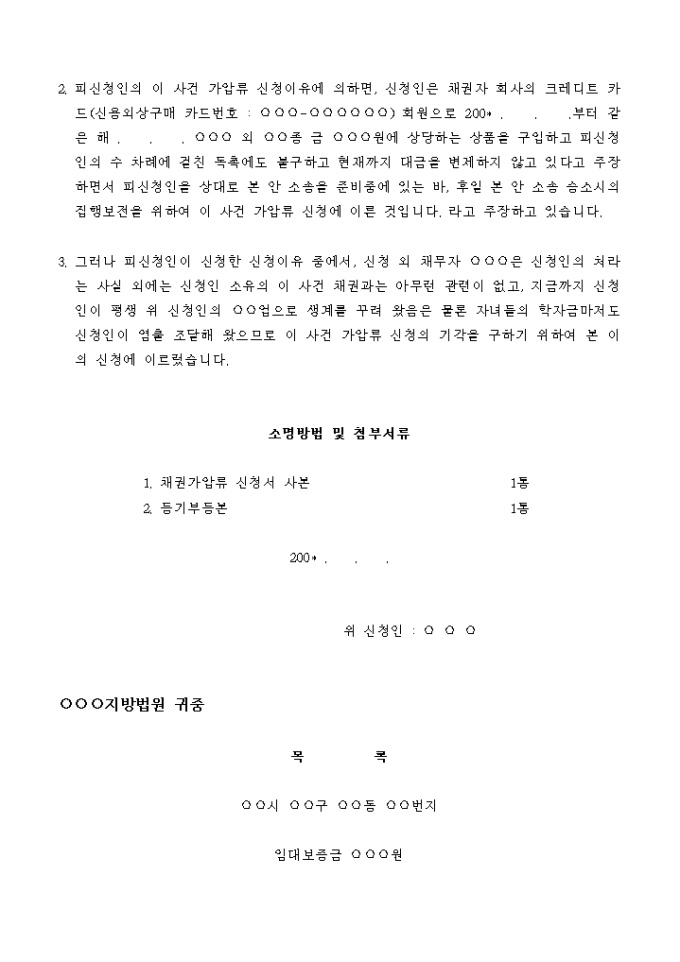 9,000원/월피신청인(채권자)의 신청인(채무자)에 대한 귀 원 ○○○호 채권가압류 신청사건에 관하여 피신청인은 신청인 소유인 별지 목록기재 채권에 대하여 200* . . . 가압