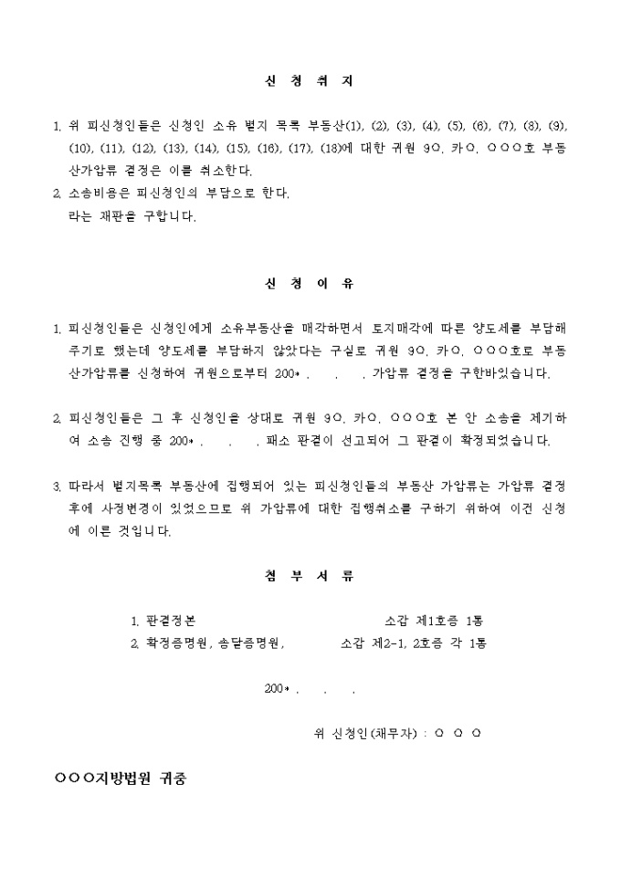 피신청인들은 신청인에게 소유부동산을 매각하면서 토지매각에 따른 양도세를 부담해주기로 했는데 양도세를 부담하지 않았다는 구실로 귀원 9○. 카○. ○○○호로 부동산가압류를