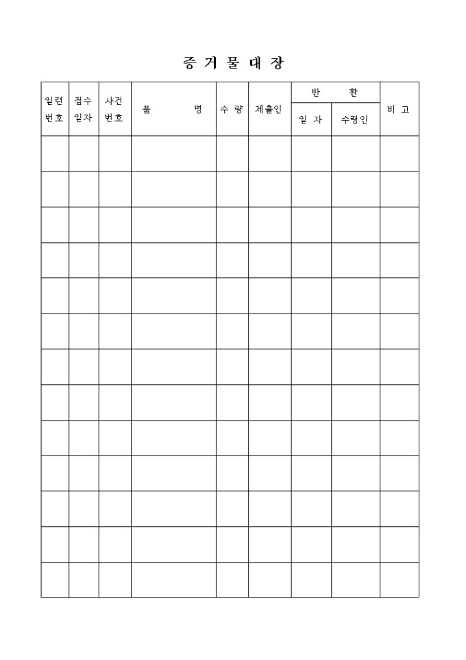 증거물대장(일련번호, 접수일자, 사건번호, 품명, 수령, 제출인, 반환)