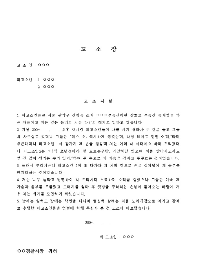 9,000원/월피고소인들은 서울 관악구 신림동 소재 ○○○부동산이란 상호로 부동산 중개업을 하는 자들이고 저는 같은 동네의 서울 다방의 레지로 일하고 있습니다.