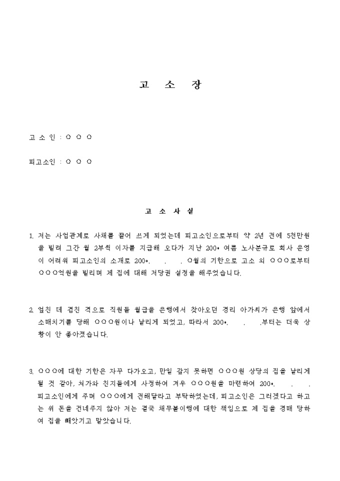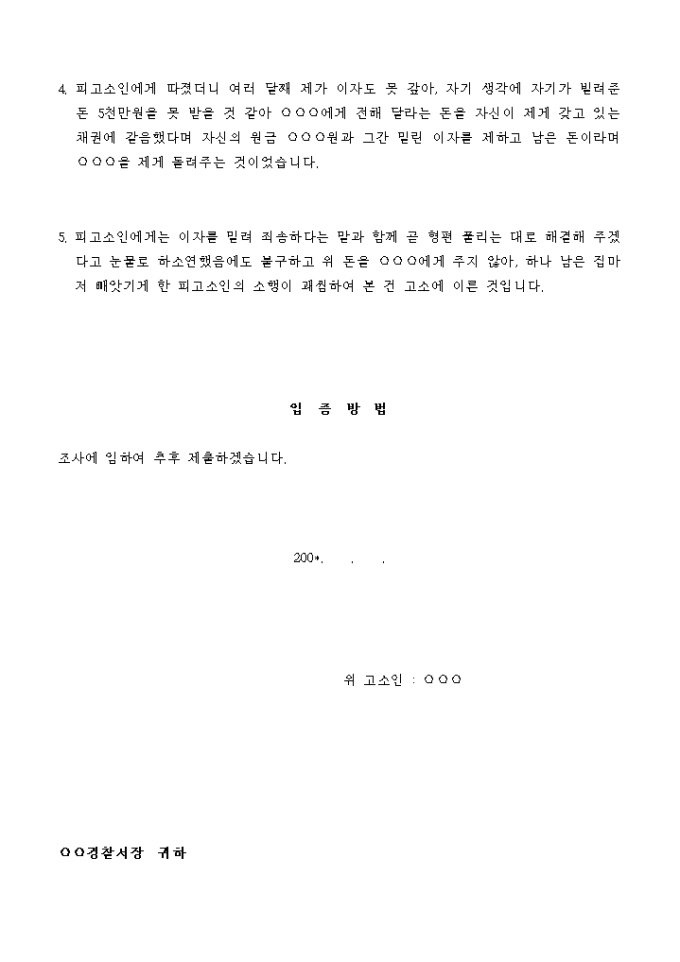 저는 사업관계로 사채를 끌어 쓰게 되었는데 피고소인으로 부터 약 2년 전에 5천만원을 빌려 그간 월 2부씩 이자를 지급해 오다가 지난 200* 여름 노사분규로 회사 운영이 어