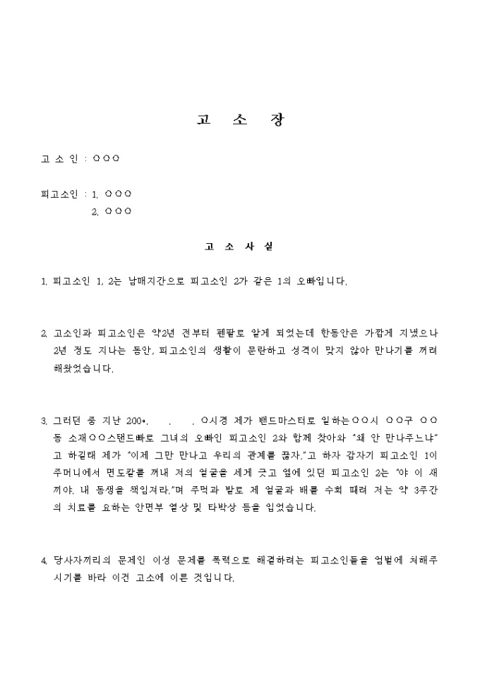 피고소인 1, 2는 남매지간으로 피고소인 2가 같은 1의 오빠입니다. 고소인과 피고소인은 약2년 전부터 펜팔로 알게 되었는데 한동안은 가깝게 지냈으나 2년 정도 지나는