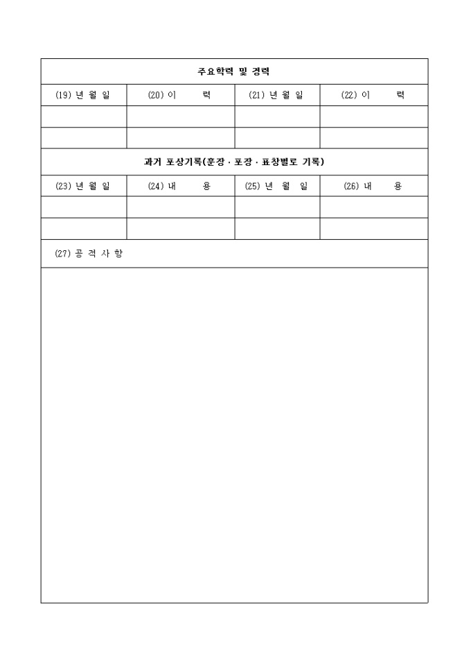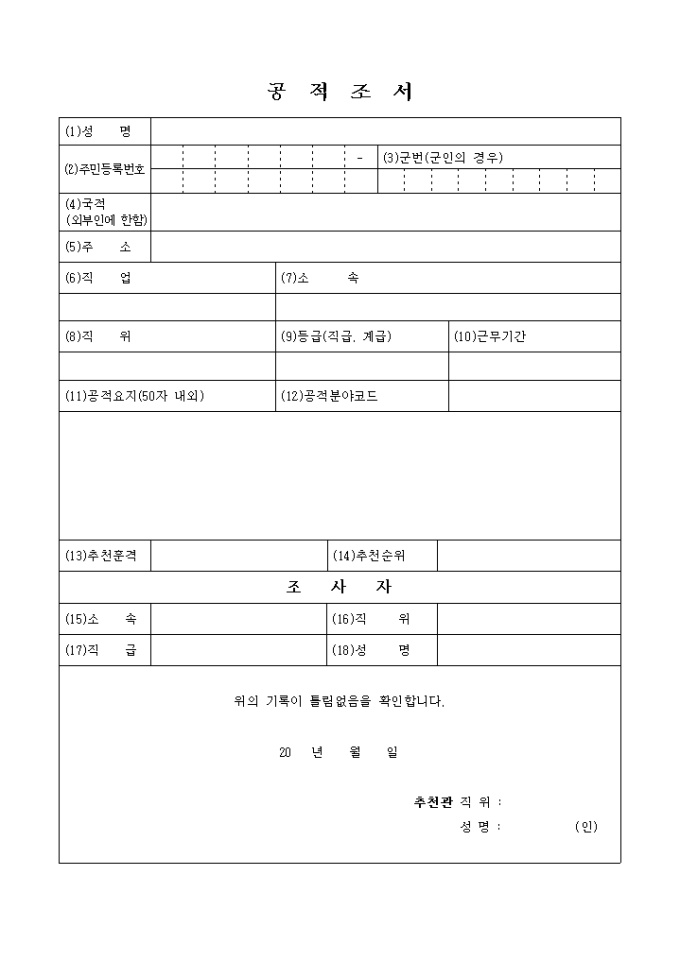 조사자, 주요학력 및 경력과거, 포상기록 등의 함목으로 구성된 군용 공적서 양식입니다.