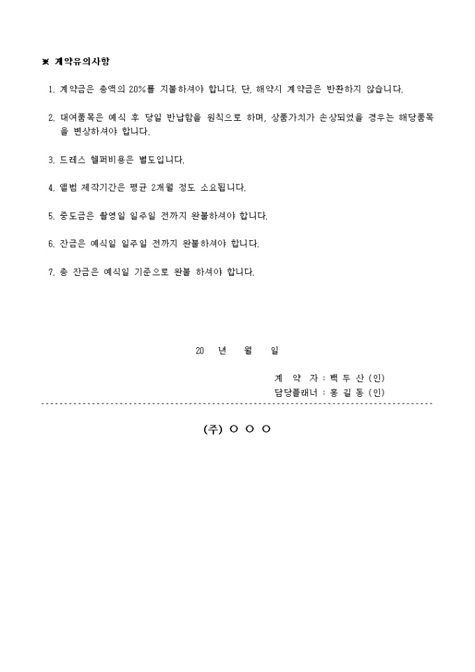 신랑, 신부의 예식일, 쵤영일, 의상, 메이크업, 등의 항목으로 만들어진 웨딩컨설팅 견적서.계약서 양식입니다.