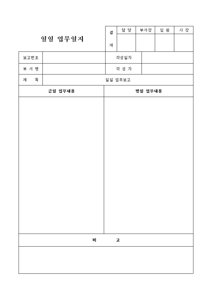 9,000원/월보고번호, 부서명, 작성일자, 작성자, 금일/명일 업무내용 등의 항목으로 구성된 일일 업무일지 양식입니다.
