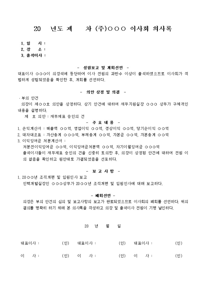9,000원/월성원보고 및 개회선언, 의안 상정 및 의결, 주요내용, 보고사항, 폐회선언 등으로 구성된 재무제표 양식입니다.