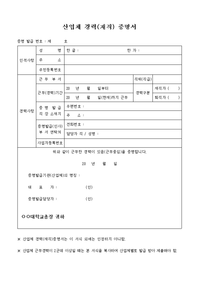 9,000원/월인적사항, 경력사항, 근무부서, 근무기간, 증명발급소재지 등의 항목으로 구성된 산업체 재직증명서 양식입니다.