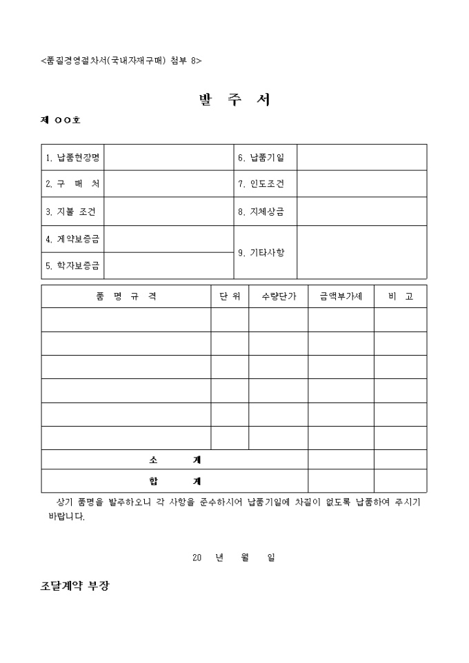 9,000원/월납품현장명, 구매처, 지불조건, 계약보증금, 학자보증금, 납품기일, 인도조건 등의 항목으로 구성된 주문발주서 양식입니다.