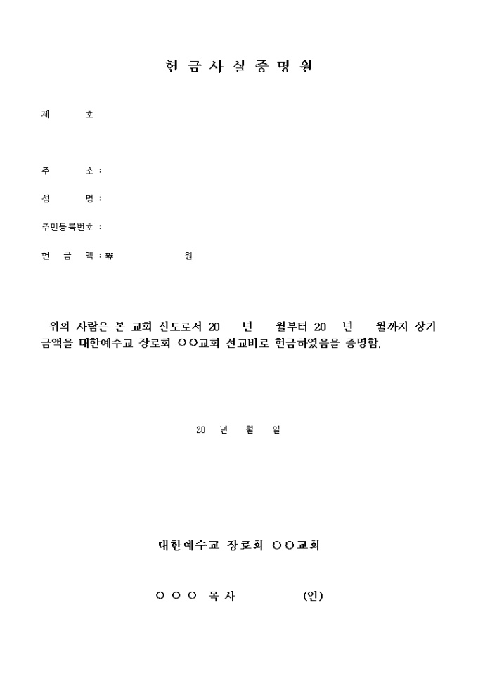 9,000원/월주소, 성명, 주민등록번호, 헌금액 등의 항목으로 구성되어있는 헌금사실증명원 양식입니다.