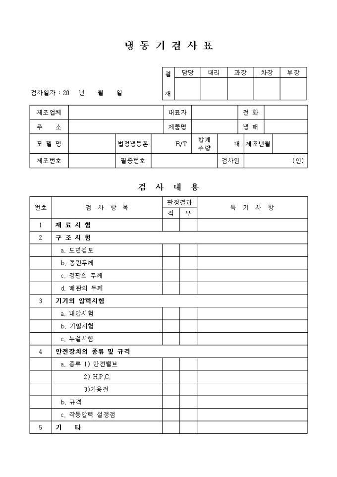 9,000원/월제조업체, 모델명, 제조번호, 검사항목, 판정결과, 특기사항 등의 항목으로 구성된 냉동기검사표 양식입니다.