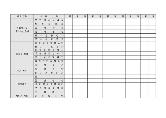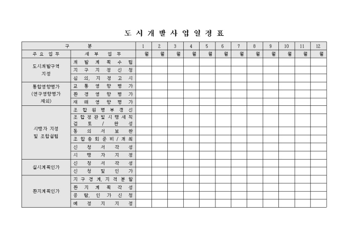 도시개발구역지정, 통합영향평가, 시행자 지정 및 조합설립, 실시계획인가, 실시계획인가, 환지계획인가, 문화재시굴 대지조성 공사 등의 항목으로 구성된 도시개발사업일정표 양식입니다.