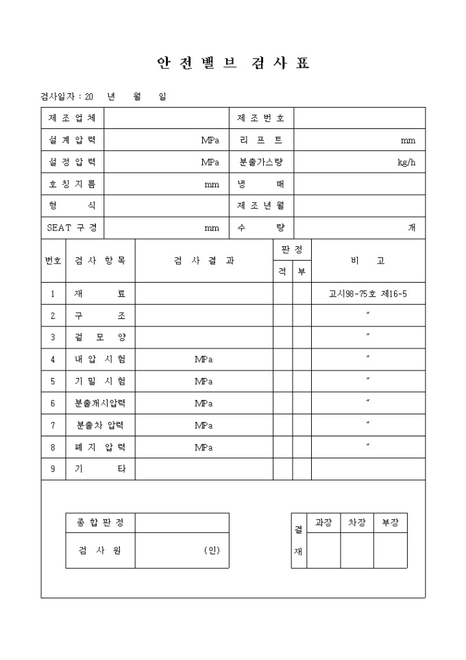 9,000원/월제조업체, 제조번호, 설계압력, 리프트, 설정압력 등의 항목으로 구성된 안전밸브검사표 양식입니다.