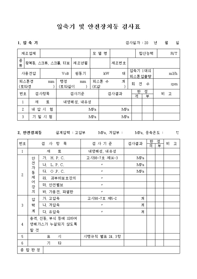 9,000원/월압축기제조업체, 모델명, 합산능력, 종류, 사용전압, 안전장치검사항목 등의 항목으로 구성된 압축기 및 안전장치등검사표 양식입니다.