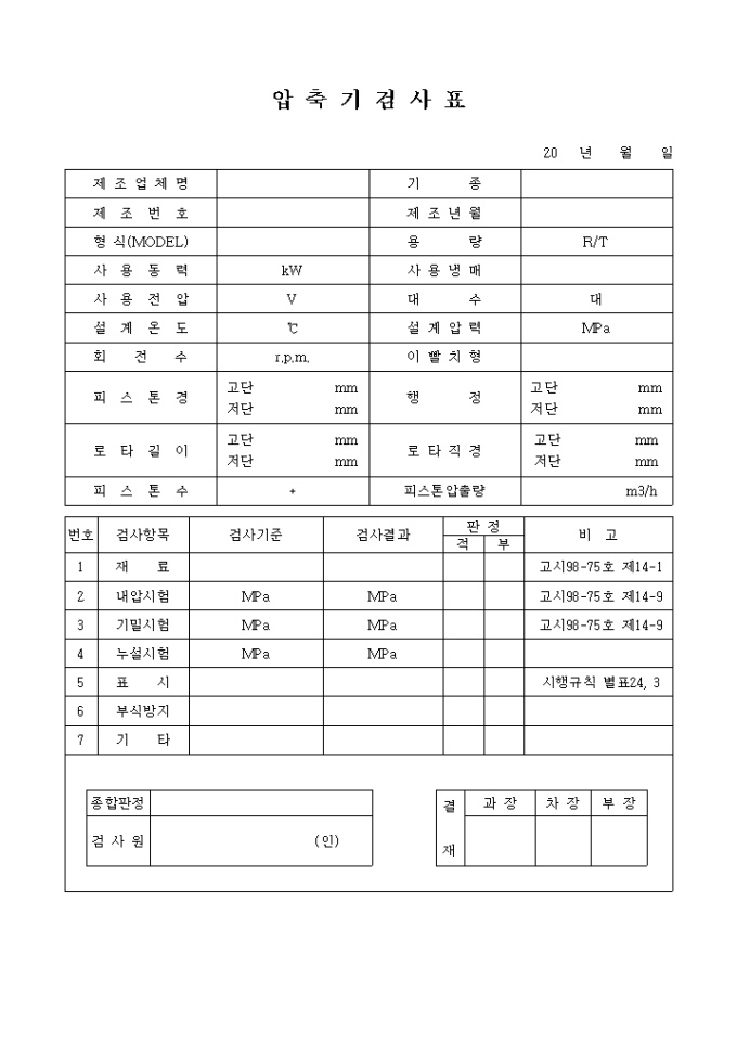 9,000원/월제조업체명, 기종, 제조번호, 제조년월, 형식, 용량 등의 항목으로 구성된 압축기검사표 양식입니다.
