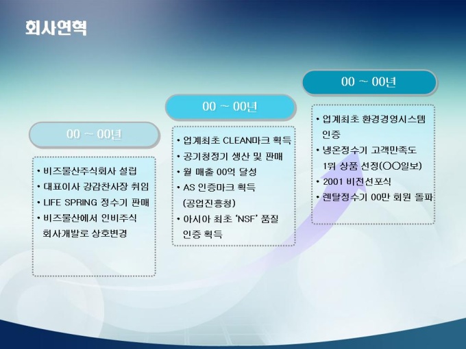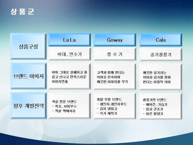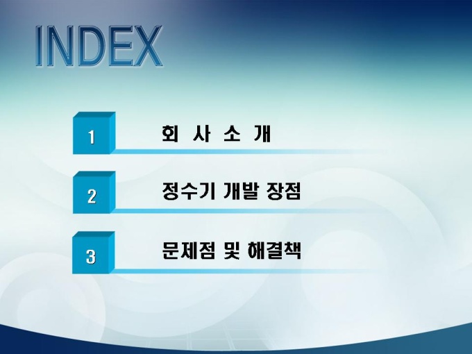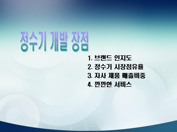 <목차> 1. 회사소개 1-1 회사개요 1-2 설립취지 및 경영이념 1-3 상품군 1-4 회사 조직도 1-5 수상경력 및 인정마크 1-6 회사비젼 2. 정수기 개발 장점 2-1 브랜드 인지도 2-2 정수기 시장점유율 2-3 자사 제품 매출비중 2-4 깐깐한 서비스 3. 문제점 및 해결책 3-1 문제점 3-2 대응책 3-3 해결책 및 대안
