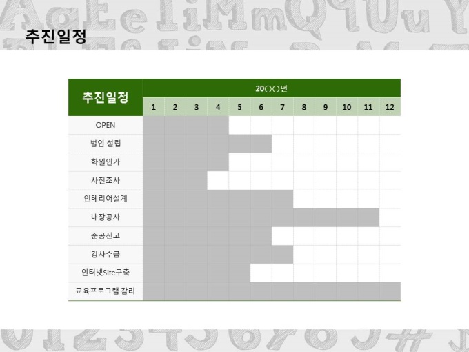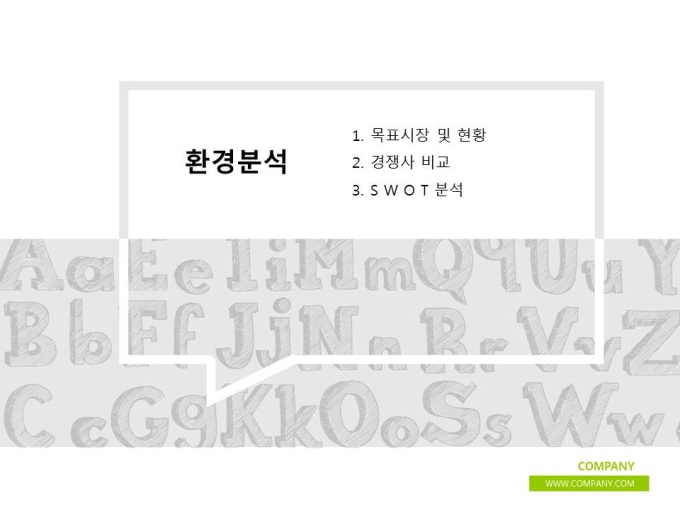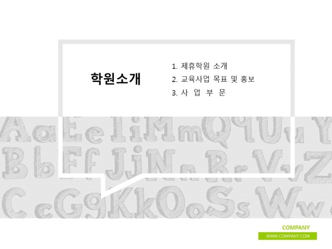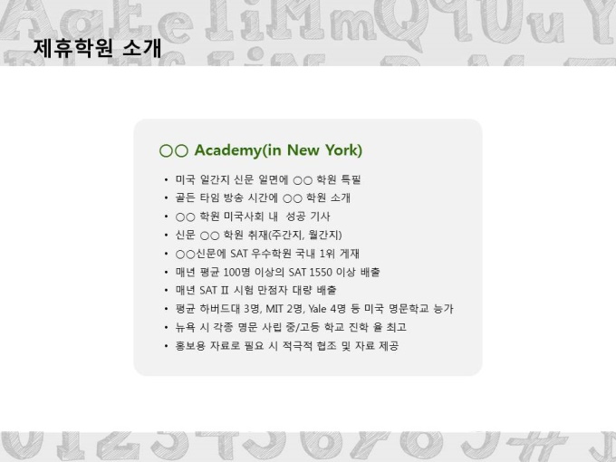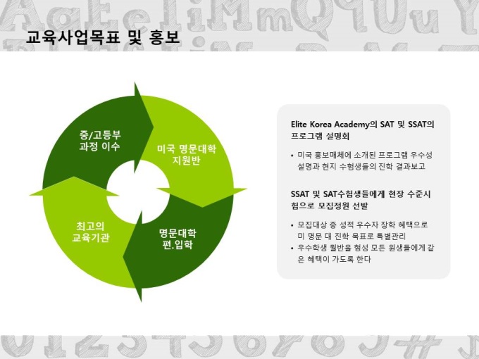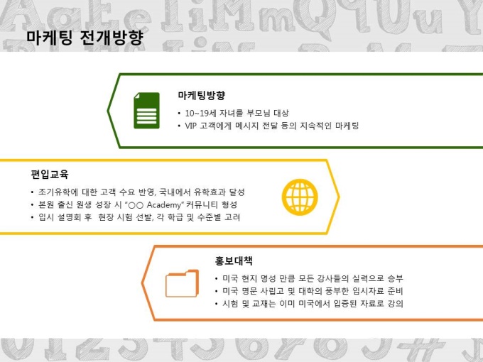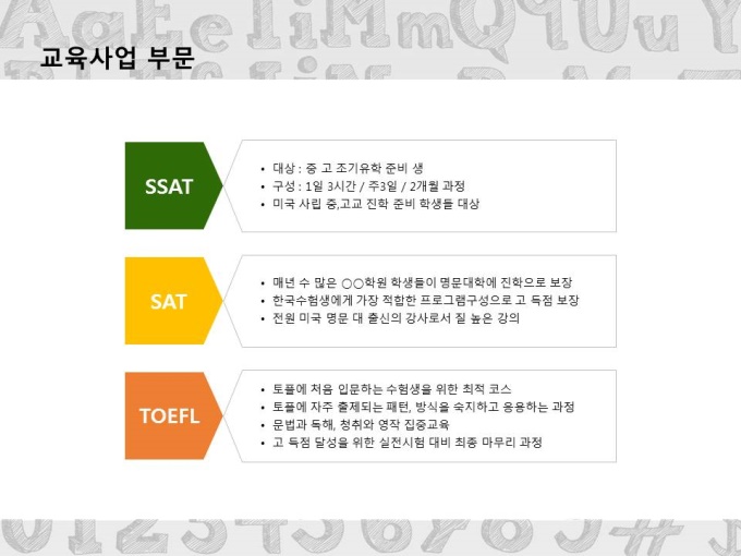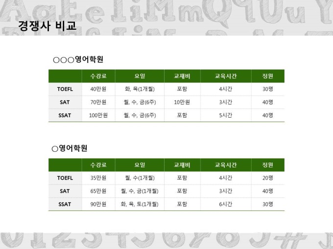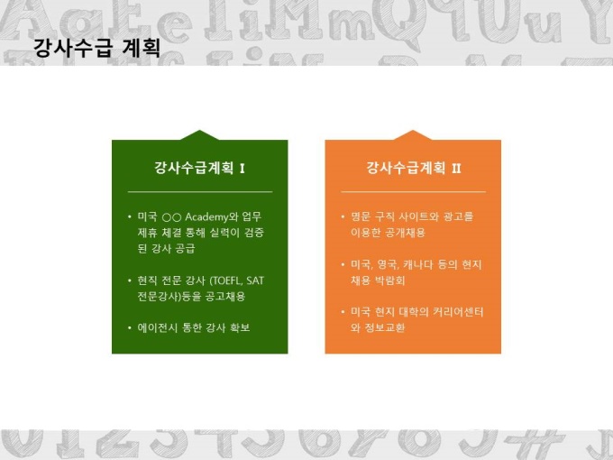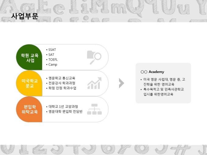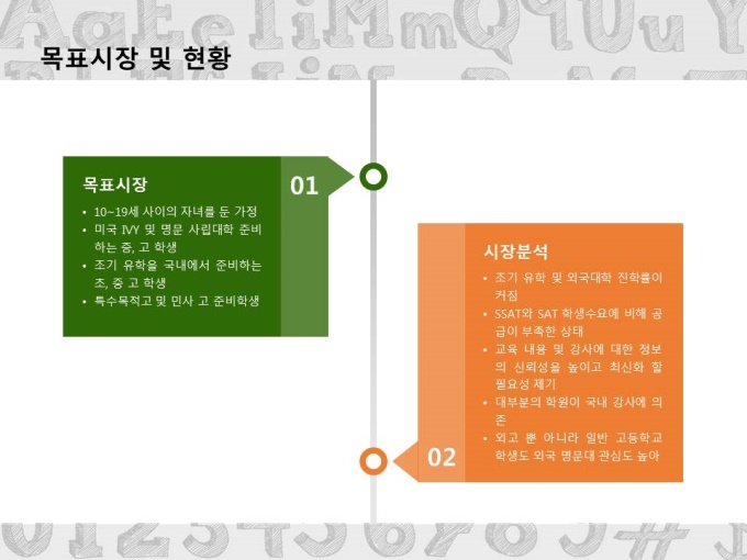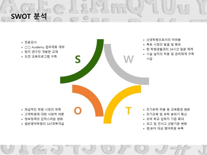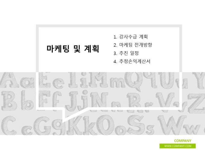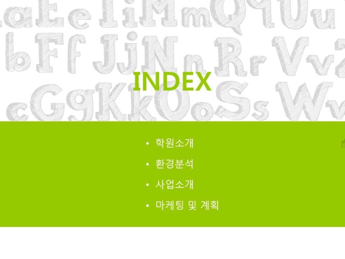 <목차> 1. 학원소개 1-1 제휴학원 소개 1-2 교육사업 목표 및 홍보 1-3 사업부분 2. 환경분석 2-1 목표시장 및 현황 2-2 경쟁사 비교 2-3 SWOT 분석 3. 사업소개 3-1 교육사업 부분 3-2 순차적 연계 프로그램 3-3 사업 추진계획 4. 마케팅 및 계획 4-1 강사수급 계획 4-2 마케팅 전개방향 4-3 추진 일정 4-4 추정손익계산서
