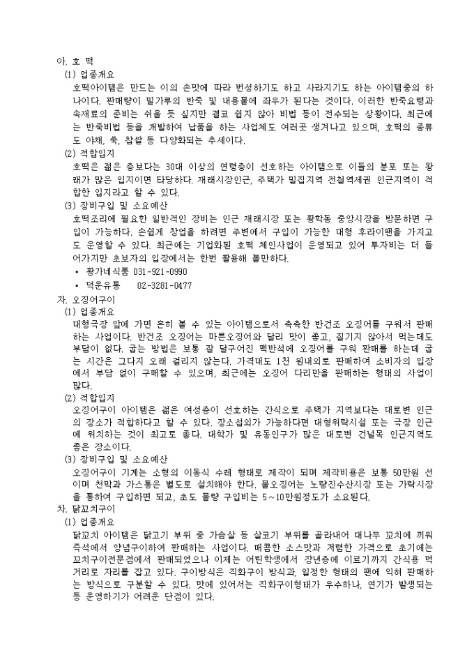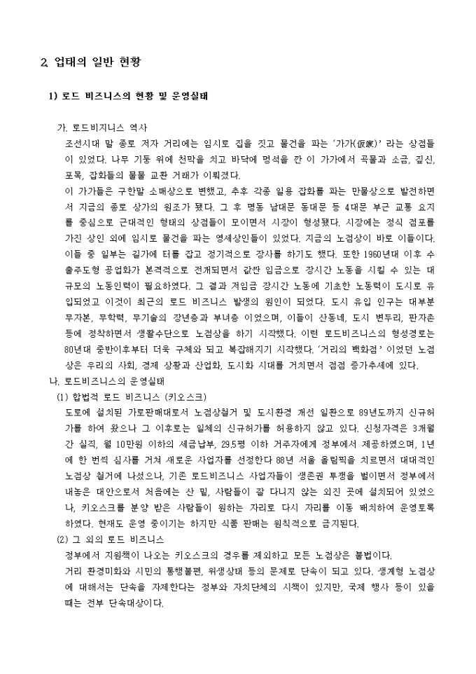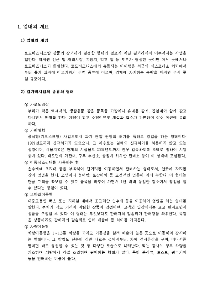 업태의 개요, 업태의 일반현황, 창업절차, 상권분석 및 입지선정 등의 항목으로 구성되어있는 노점(로드비지니스) 창업가이드입니다.