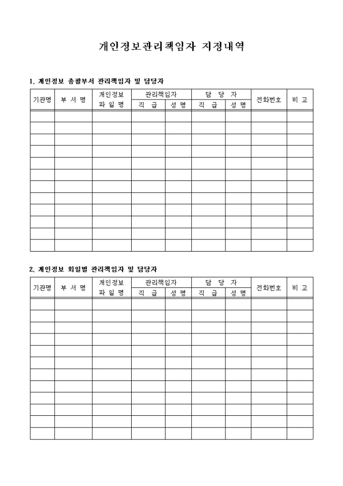 기관명, 부서명, 개인정보파일명, 관리책임자, 담당자, 전화번호 등의 항목으로 구성된 개인정보관리책임자 지정내역서 양식입니다.
