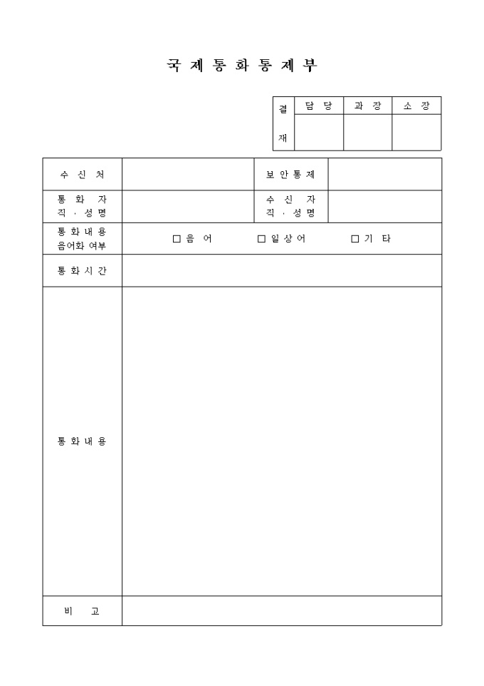 수신처, 보안통제, 통화자 직, 성명, 수신자 직, 성명 통화 내용의 음어화여부 등의 항목으로 구성된 국제통화통제부 양식입니다