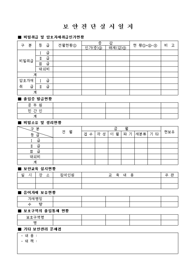 비밀취급 및 암호자재취급인가현황, 출입증 발급현황, 비밀소유 및 정리현황, 보안교육 실시현황 등의 항목으로 구성된 보안진단 실시일지 양식입니다.