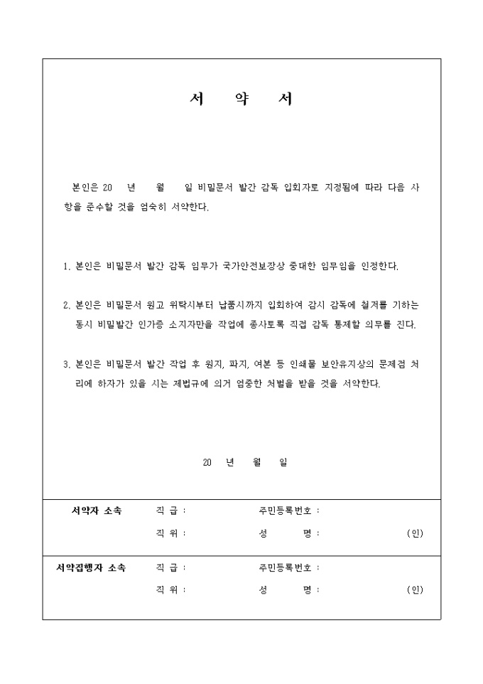 본인은 비밀문서 발간 감독 입회자로 지정됨에 따라 다음 사항을 준수할 것을 엄숙히 서약한다는 내용의 비밀문서발간 서약서 양식입니다.