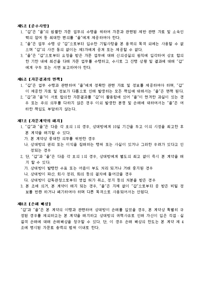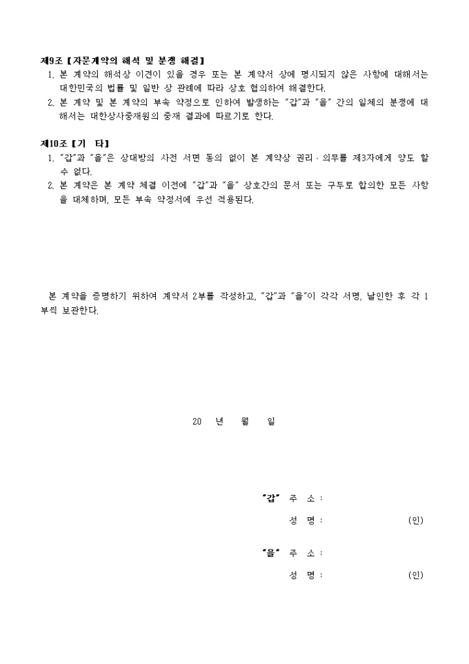 9,000원/월자문의 목적, 자문의 범위, 자문기간 및 권리, 자문수수료 등의 10개조 항으로 구성된 컨설팅계약서 양식입니다.