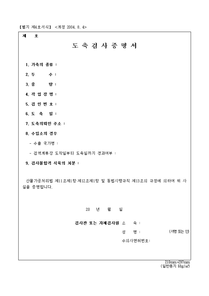 가축의 종류, 두수, 중량, 작업장명, 검인번호 등의 항목으로 구성된 축산물 등급판정소에서 발급하는 도축검사증명서 양식입니다.