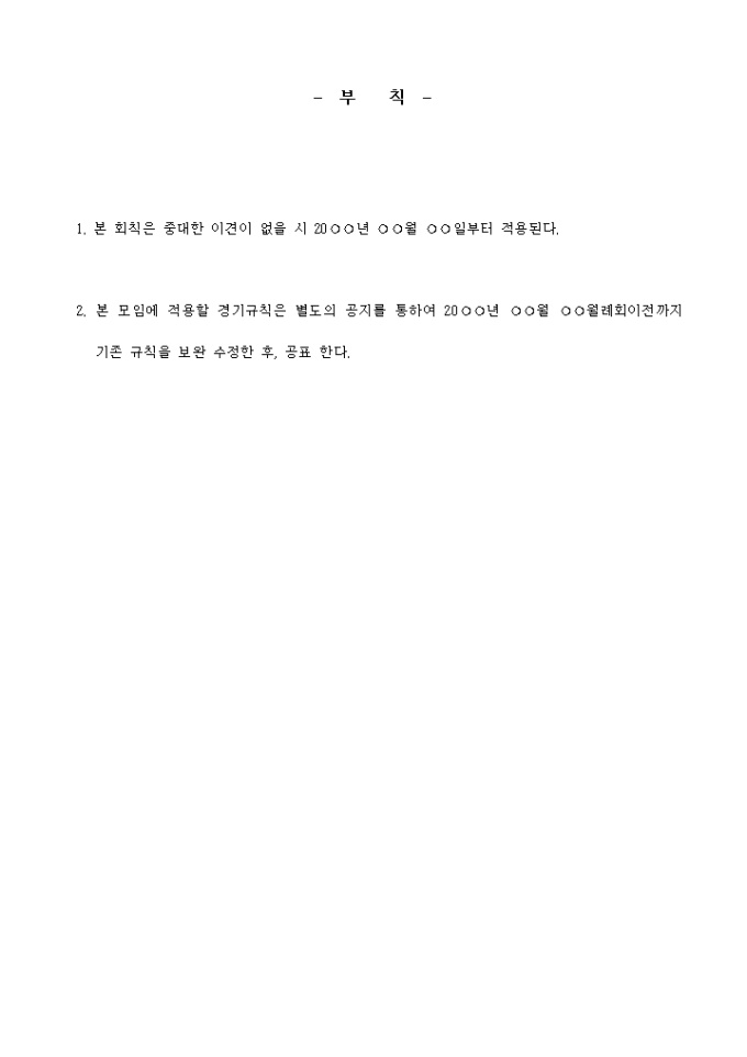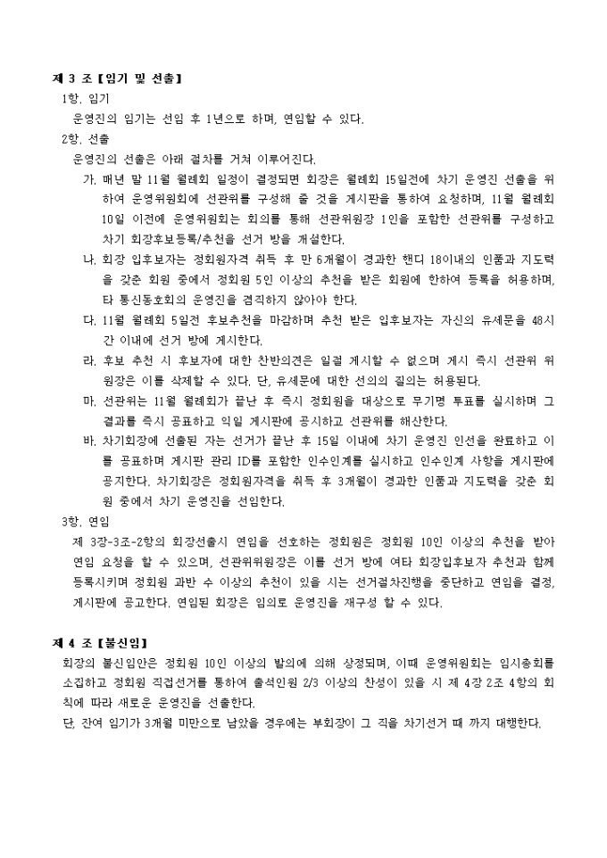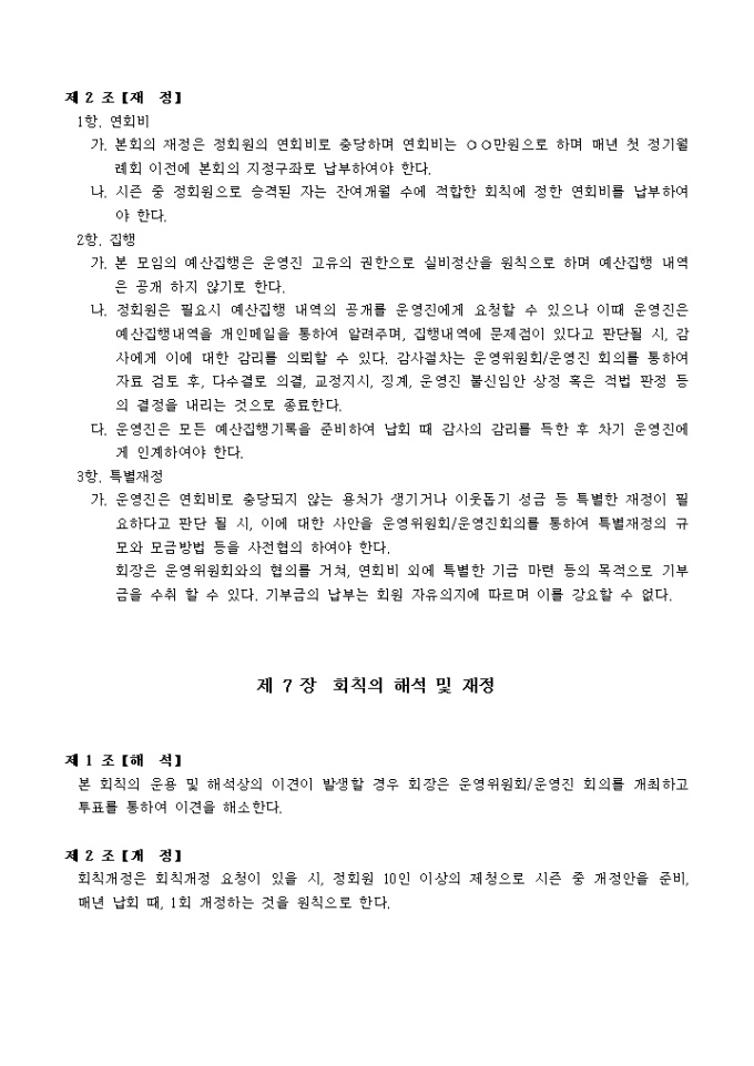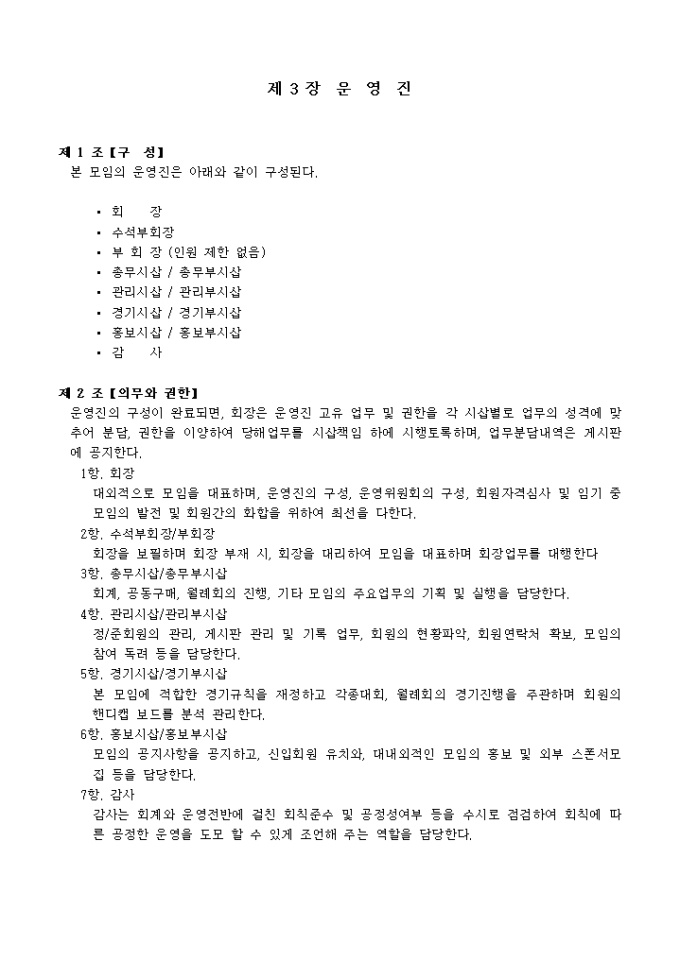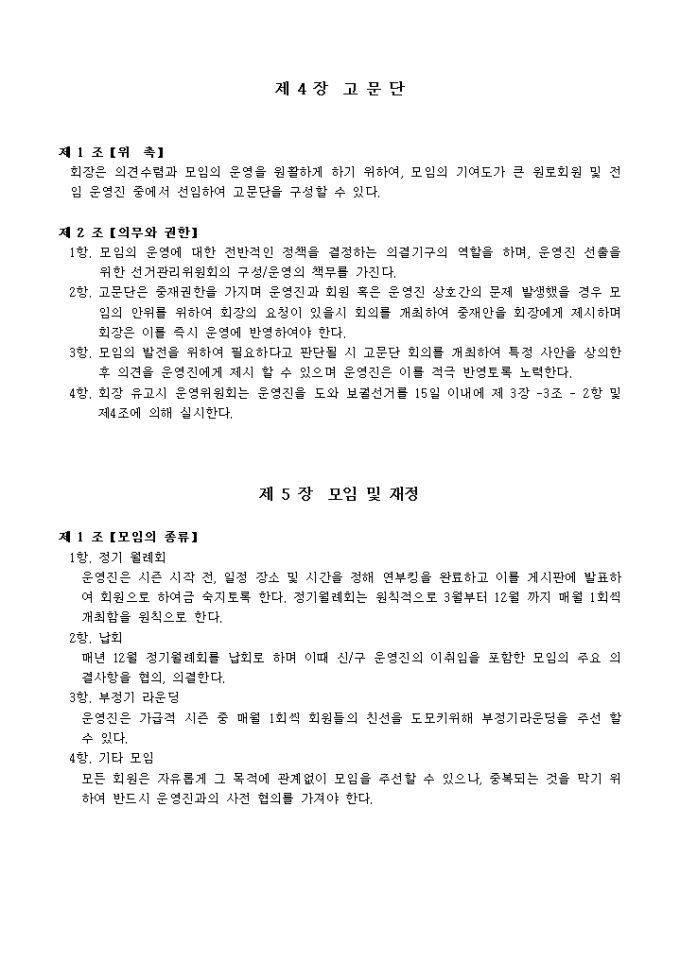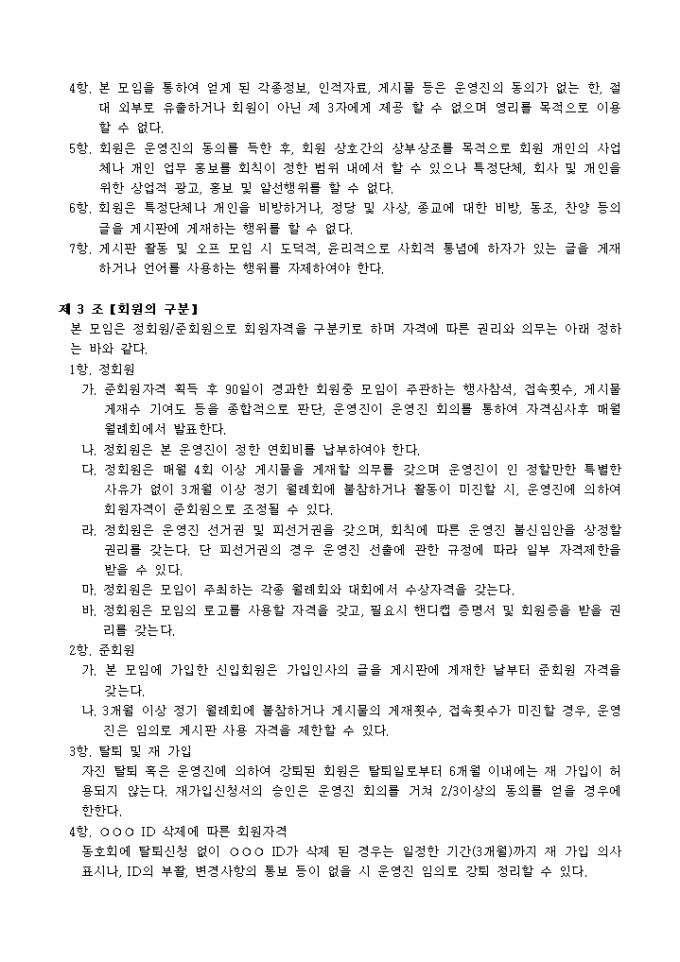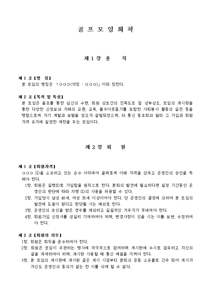 9,000원/월명칭, 목적 및 특성, 회원자격, 회원의 의무, 회원의 구분, 운영진구성 등 총 7장으로 구성된 골프모임 회칙입니다.