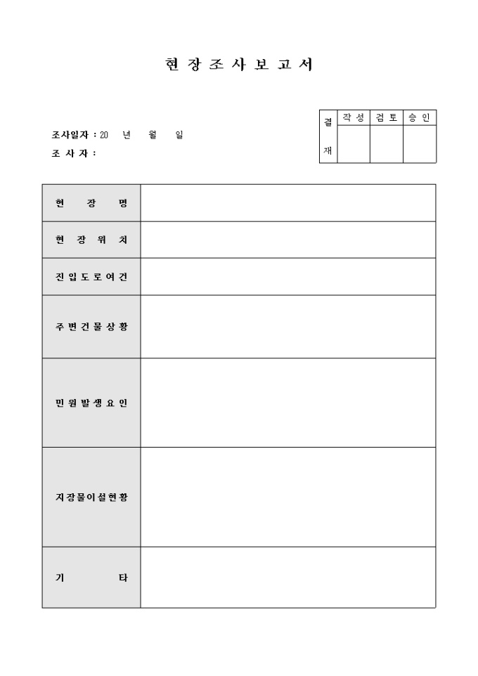 현장명, 현장위치, 진입도로여건, 주변건물상황, 민원발생요인, 조사자 등의 항목으로 구성된 현장조사 보고서 양식입니다.
